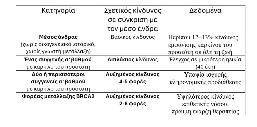 Ένας άνδρας χωρίς οικογενειακό ιστορικό μπορεί να αντιμετωπίσει 12-13% πιθανότητες να αναπτύξει τη νόσο στη ζωή του, ενώ όσοι έχουν πολλούς πάσχοντες συγγενείς ή μεταλλάξεις BRCA2 μπορεί να αντιμετωπίσουν πολλαπλάσια πιθανότητα.